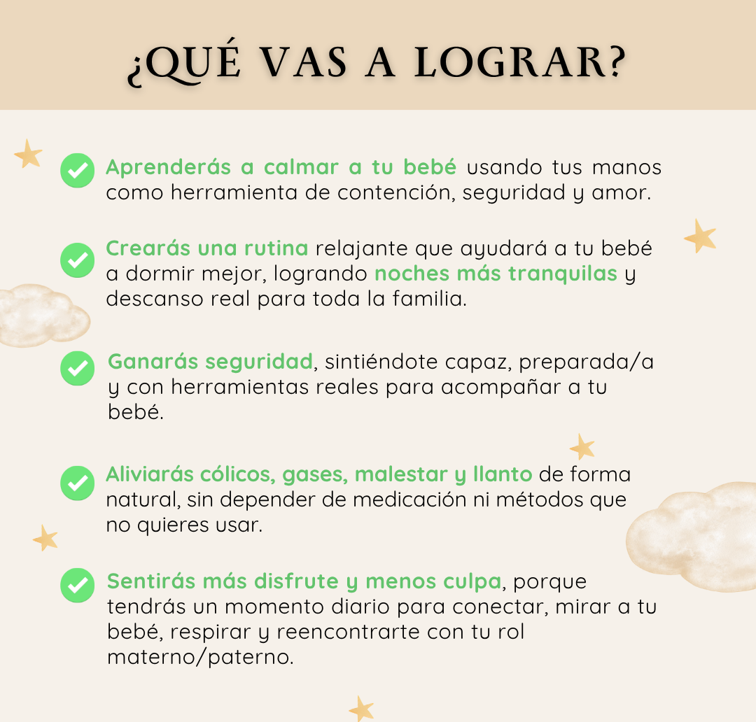 La mayoría nota más calma y mejor descanso desde la primera semana. También suelen disminuir los episodios de llanto y mejorar la digestión y el vínculo emocional progresivamente.